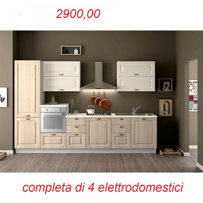 COMPOSIZIONE IN LEGNO NATURALE PENSILI PANNA COMPLETA DI FRIGORIFERO FORNO LAVASTOVIGLIE PIANO COTTURA LUNGHEZZA CM 330