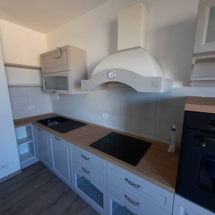 cucina in legno laccato poro aperto in grigio tortora con piano in legno naturale isola con boiserie in legno