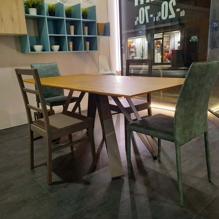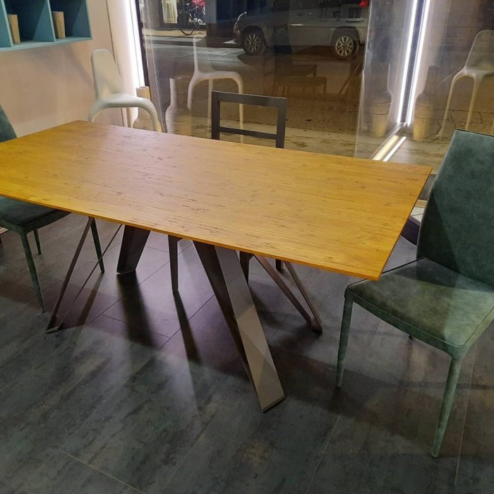 tavolo con piano in massello scortecciato naturale basamento in alluminio laccato